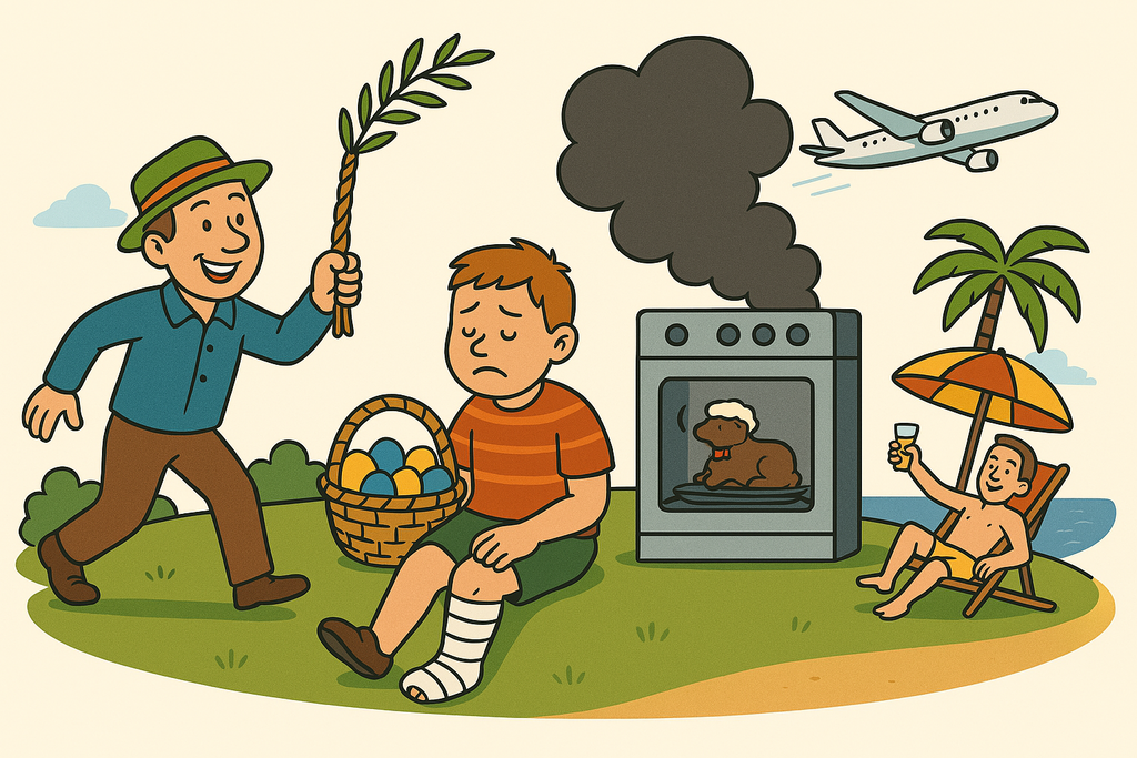 Veľká noc - sviatky jari, znovuzrodenia, čokoládových vajíčok a... rizík? Áno, čítate správne. Hoci sa Veľká noc tvári ako idylické obdobie plné farebných kraslíc a detských úsmevov, môže sa stať všeličo. Preto sme pre vás pripravili veľkonočný "návod na prežitie", teda čo všetko sa môže stať pri šibaní.